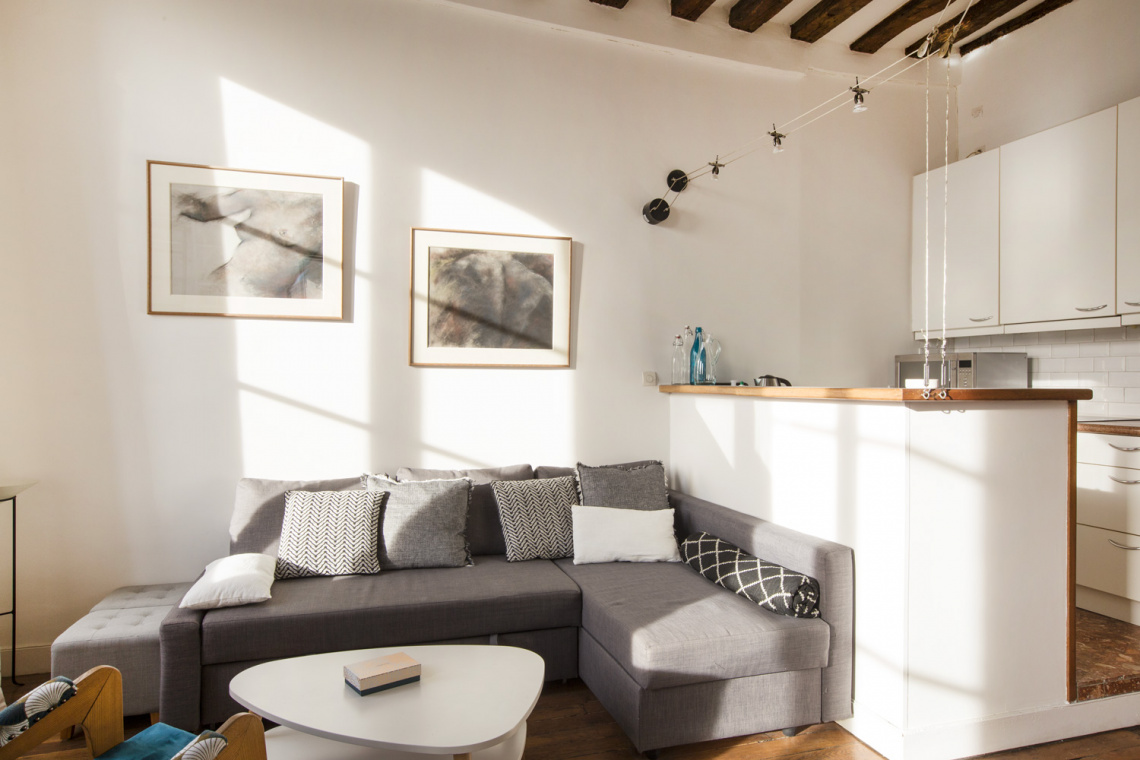 Möblierte Wohnung in Paris von 41M2, Lage: rue Saint Antoine im 4. Arrondissement von Paris, Bastille-Viertel, in einem Pariser Wohnanlage 4 OG.