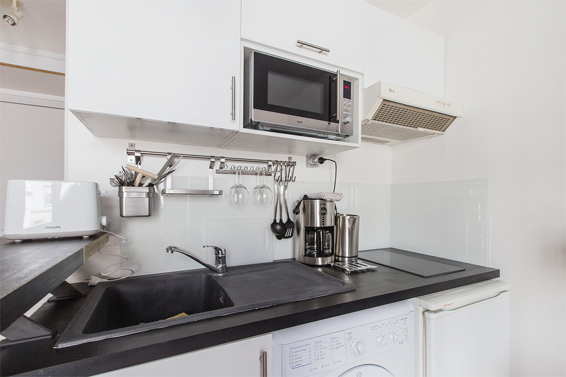 Studio meublé à Paris d'environ 15m2, situé passage Thiéré dans le 11ème arrondissement de Paris - quartier Bastille, dans un immeuble parisien de standing, au 1er étage avec ascenseur.